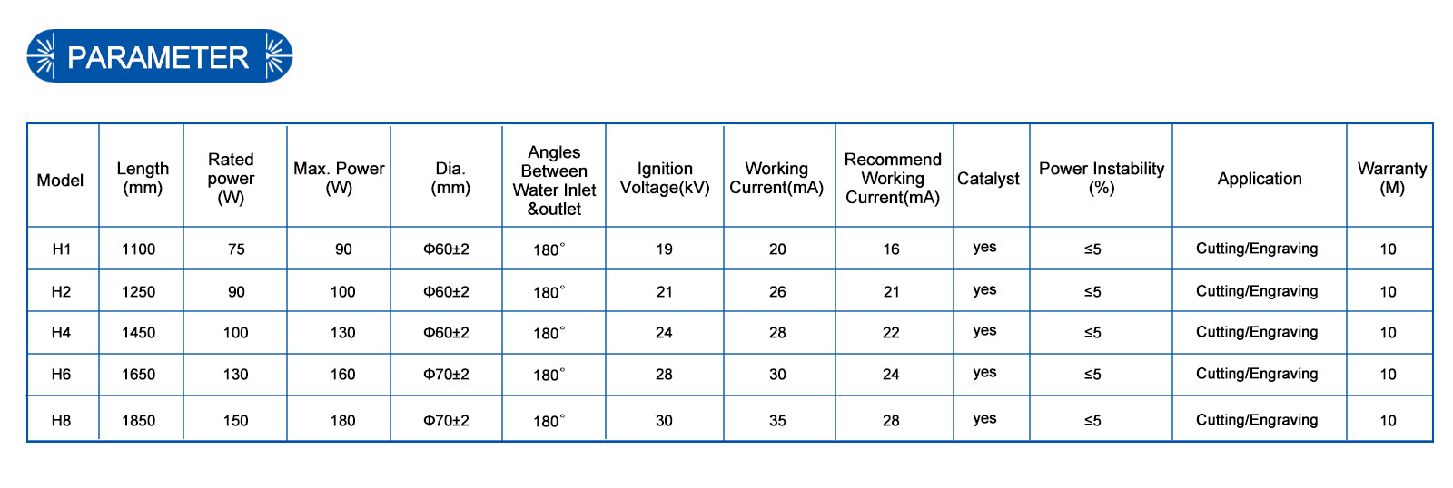 Yongli H Series CO2 Laser Tube