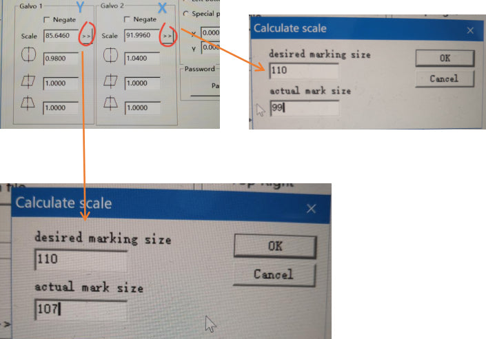 5단계: "Param(F3)"을 클릭합니다. Galvo1은 X를 나타내고 Galvo2는 Y를 나타냅니다. 그림에 표시된 빨간색 원을 클릭하여 X 방향의 '원하는 마킹 크기'와 '실제 마킹 크기'를 변경하고 우리가 측정한 Y 방향입니다.