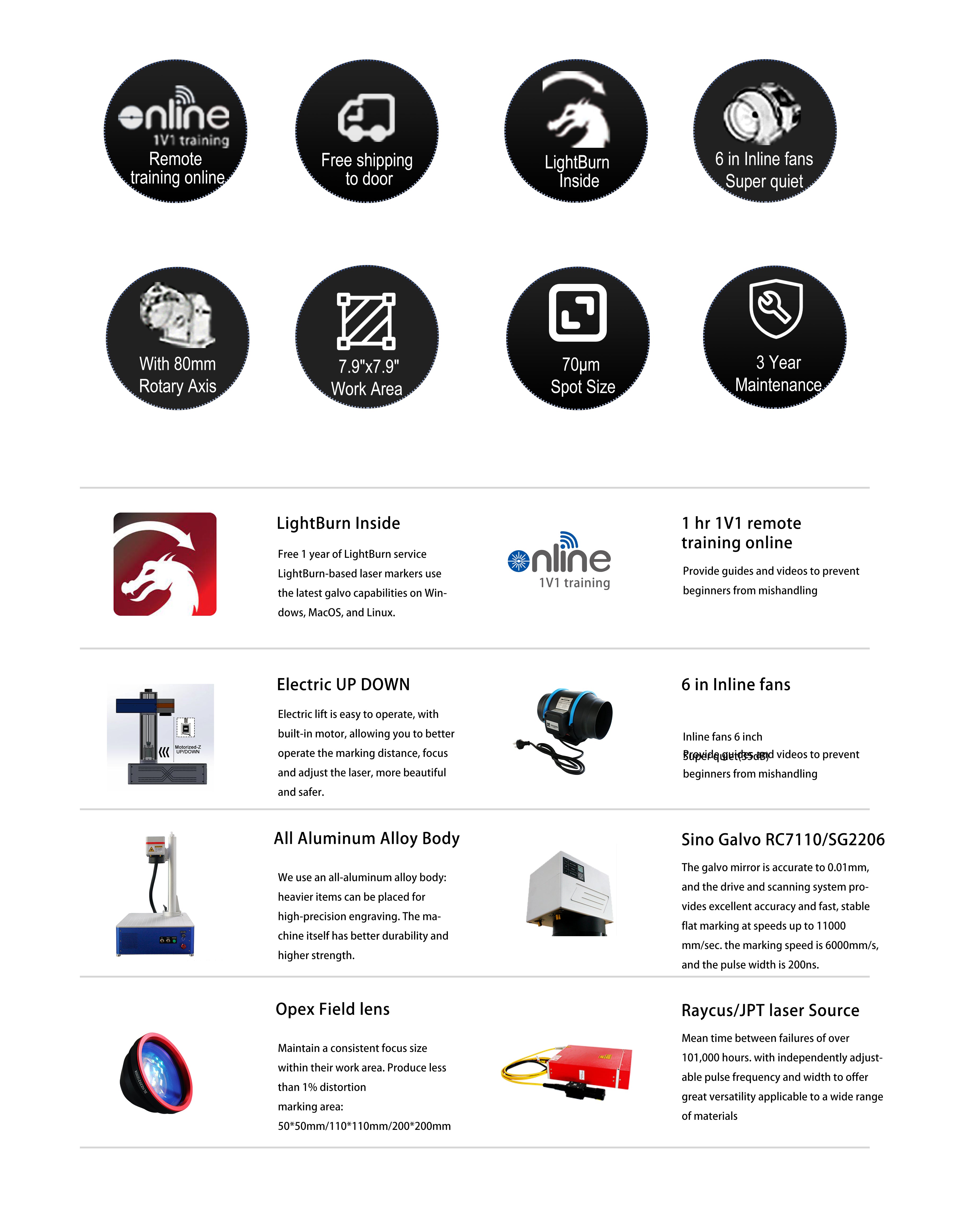 На складе США NouaLaser волоконная лазерная маркировочная машина, электрическая UP DOWN, включает LightBurn, с поворотной осью, 6-дюймовые линейные вентиляторы, очки OD7 +